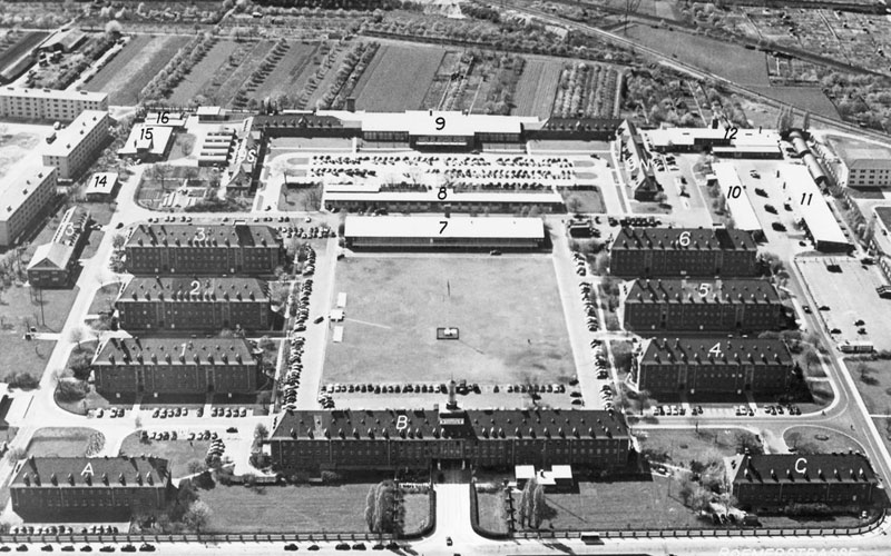 The historic Campbell Barracks buildings to the west of Römerstrasse are part of the former “Greater German Barracks”, built in the late 1930s and taken over by the US Army in 1945. Campbell Barracks have always been of great military importance. They once housed the headquarters of the US armed forces in Europe and of the ground forces of NATO. Most of the barracks are now under heritage protection. Construction work on Mark Twain Village began in 1948. The residential complex extends along both sides of Römerstrasse. The first new residents moved into the renovated dwellings in the southeast of the district in summer 2016.