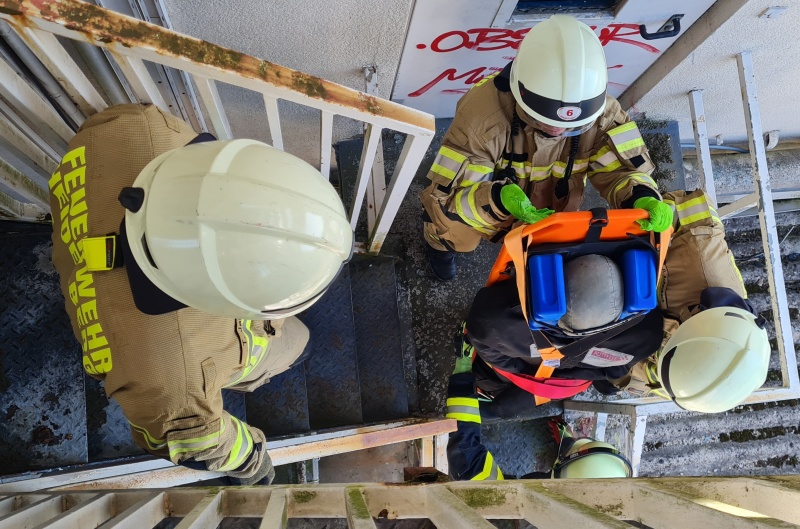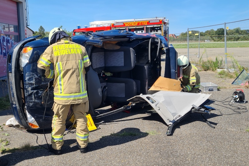 Praktischer Umgang mit Feuerlöschern Aufbau einer Saugleitung zur Wasserentnahme aus dem Neckar Auch der Umgang mit Geräten bei Verkehrsunfällen wurde geübt Rettung einer Übungspuppe über ein enges Treppenhaus Am Übungsturm im Pfaffengrund wurde das Steigen der Feuerwehrleiter geübt Freude über die bestandene Prüfung