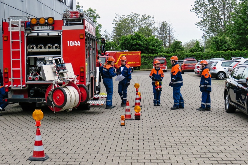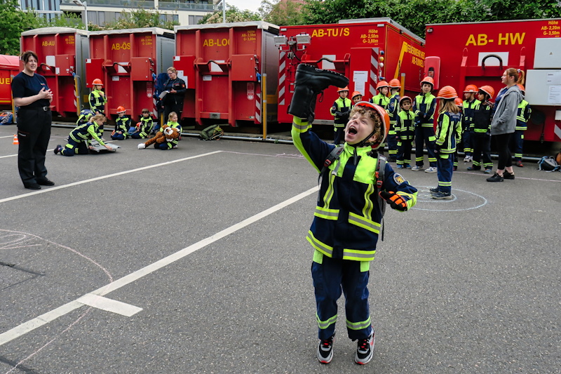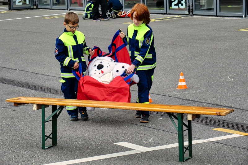 Bereits unsere Kleinsten aus den Kindergruppen zeigten eindrucksvoll ihr Können. So trugen Sie z.B. eine verletzte Person mit einem Tragetuch durch einen Parcour. Teamarbeit war gefragt, als sie zu viert stehend auf einer Cola-Kiste sich gegenseitig beim Anziehen von Uniform und Helm helfen mussten. Sichtlich viel Spaß hatten alle beim Stiefel-Weitwurf.