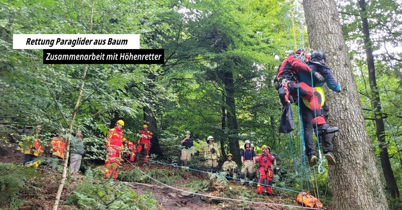 🔹 Gemeinsam mit den Kollegen der Höhenrettung der Berufsfeuerwehr Karlsruhe und dem KIT Karlsruhe retteten wir einen Paraglider, der sich in rund 18 Meter Höhe in einem Baum verfangen hatte