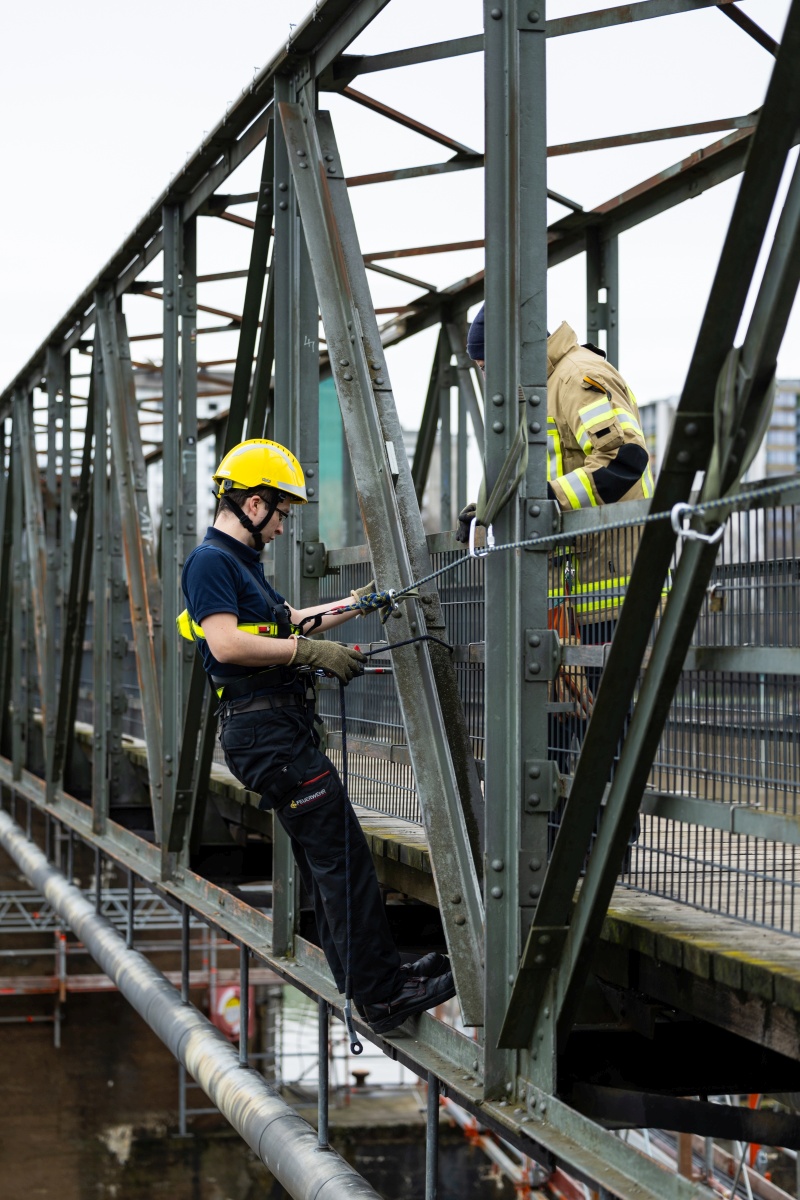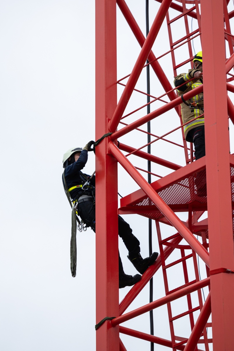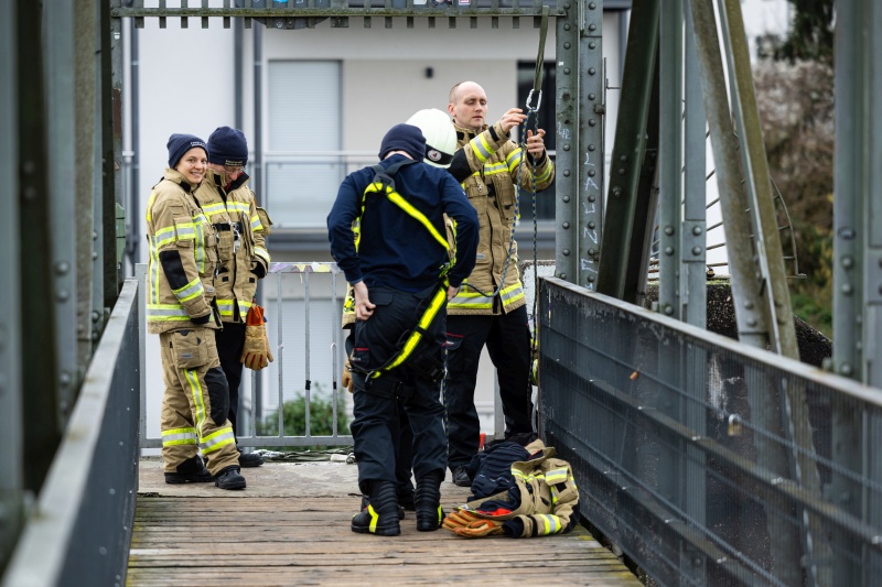 Während es am ersten Lehrgangstag mit den theoretischen Grundlagen noch beschaulich zuging, mussten die Teilnehmer an den beiden folgenden Tagen beweisen, dass sie schwindelfrei sind: am Wieblinger Wehrsteg sowie an einem Baukran wurde der horizontale und vertikale Vorstieg geübt. Am dritten Lehrgangstag wurde noch die Top-Rope-Sicherung über die Drehleiter geübt, bevor der Lehrgang mit einer Prüfung erfolgreich beendet wurde.