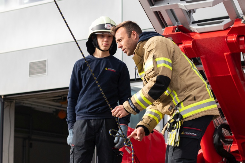 Sechs Teilnehmer aus mehreren Abteilungen der Freiwilligen Feuerwehr Heidelberg haben den Umgang mit dem Absturzsicherungsset erlernt.