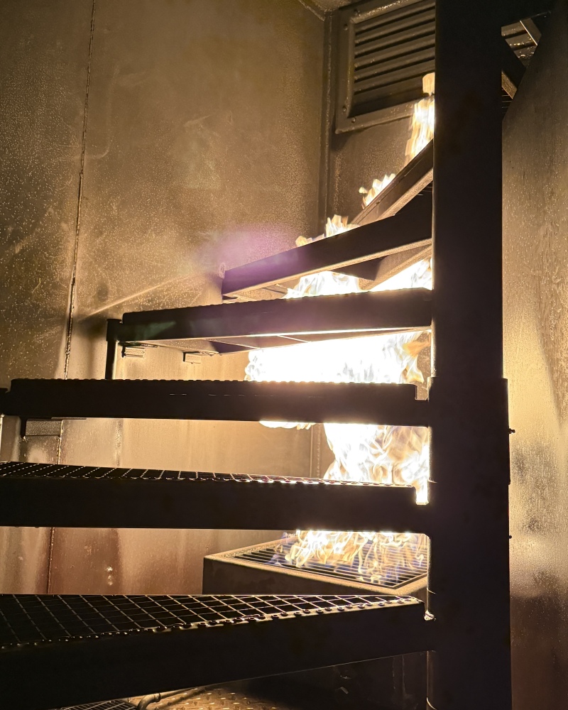 Dort konnten die Lehrgangsteilnehmer in der holzbefeuerten Übungsanlage zunächst die verschiedenen Phasen der Brandentwicklung bis hin zur Rauchgasdurchzündung erleben.
