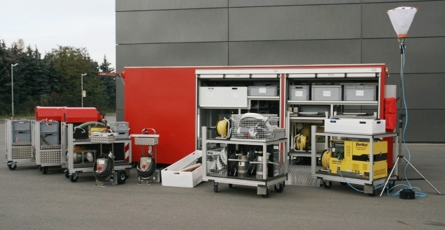 Zusätzlich zu den Pumpen sind auch mehrere mobile Stromerzeuger sowie Beleuchtungsgerät vorhanden, die auf Rollwägen verlastet sind. Dies ermöglicht einen schnellen Zugriff auf die Ausstattung und deren Transport.