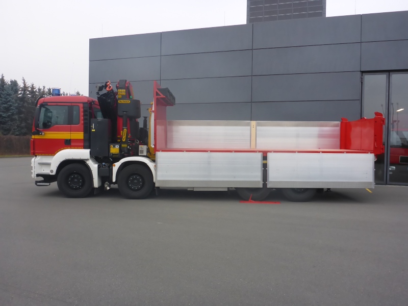 Die Seitenwände sind beideseitig abklappbar, das Heck kann über eine Tür geöffnet werden.