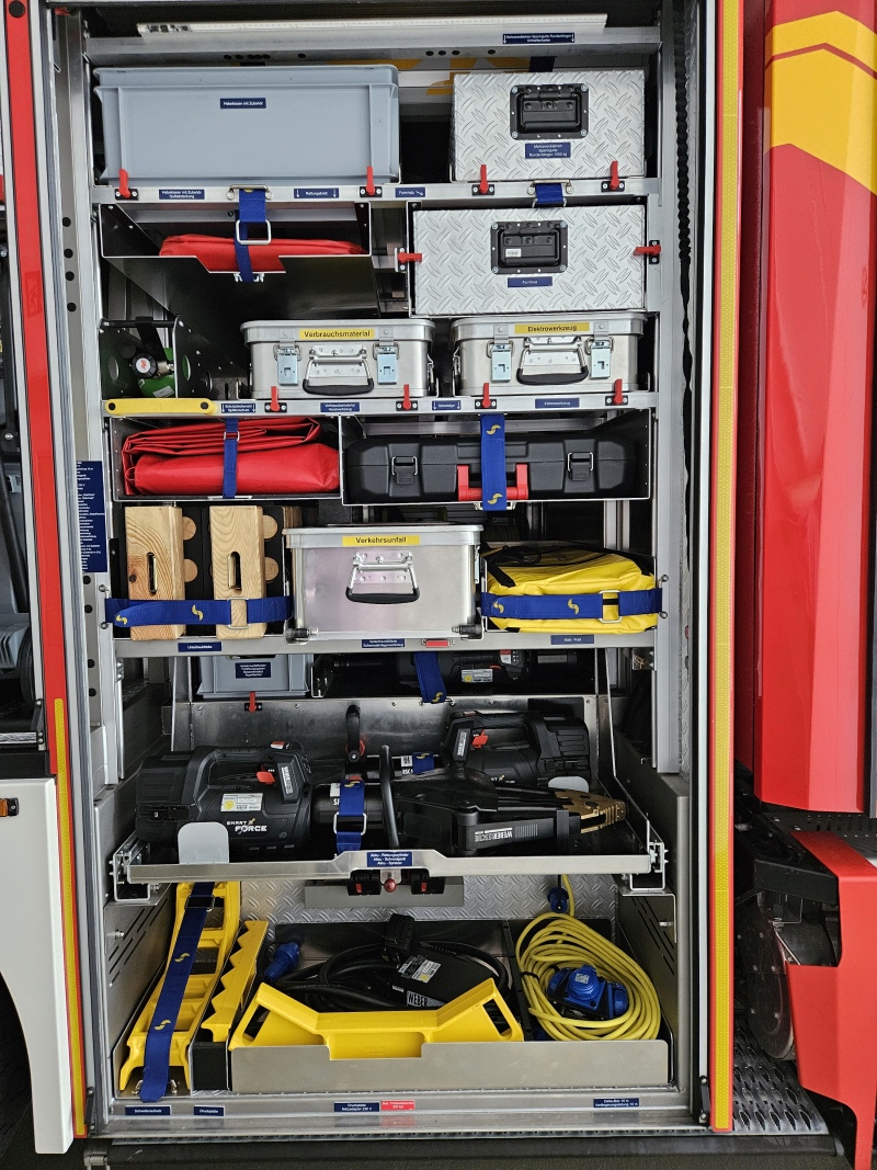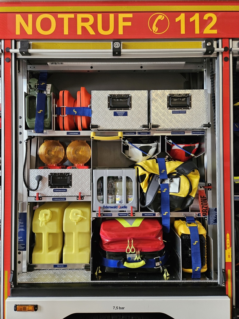Geräteräume 1 bis 5 G1 - Stromerzeuger, diverse Schutzkleidung G3 - Einsatzstellenabsicherung, Notfallrucksack G5 - Belüftungsgerät, Schaufel, Besen, Zubehör Aufzugsbefreiung, Schuttwannen Geräteräume 2 bis 6 G6 - Brechwerkzeug, Schlauchmaterial G4 - Wasserentnahme-Kit, Wassersauger, Kleinlöschgeräte G2 - hydraulisches Rettungsgerät, Werkzeug, Stabilisierungsgerät für Unfallfahrzeuge