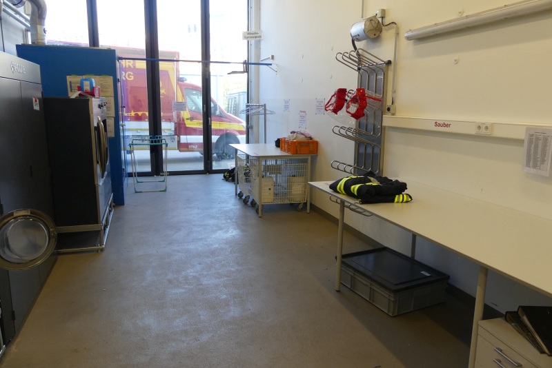 In der Wäscherei der Berufsfeuerwehr stehen Industriewaschmaschinen und -trockner zur Verfügung, über deren spezielle Programme eine schonende, aber effektive Reinigung der Kleidung erfolgt. Bei Bedarf erfolgt auch eine Imprägnierung der Kleidung direkt über das Waschprogramm.