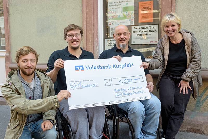 "Rolling Chocolate Heidelberg" spenden 1000 Euro an den Asylarbeitskreis Heidelberg e.V. September 2015: Die Kirchheimer Rollstuhlbasketballer "Rolling Chocolate Heidelberg" setzten ein Signal der Solidarität. Sie spendeten ihren diesjährigen Tombola-Erlös an den Asylarbeitskreis Heidelberg e.V. Die rund 550 Euro wurden von den sozial engagierten Basketballern auf glatte 1000 Euro aufgestockt. Primär verwendet werden soll das Geld für Projekte in den Bereichen Sprachförderung und Kinderbetreuung. Der sportliche Leiter Marco Hopp sprach dem Asylarbeitskreis und den Flüchtlingen zudem eine Einladung zu einem der nächsten Heimspiele der Neckarstädter aus. |
