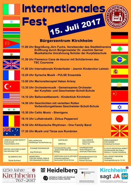 Internationales Fest in Kirchheim am 15. Juli 2017Juli 2017: Der Stadtteilverein Kirchheim lädt mit vielen Partnern zum Internationalen Fest am 15. Juli 2017 in das Bürgerzentrum Kirchheim ein. |