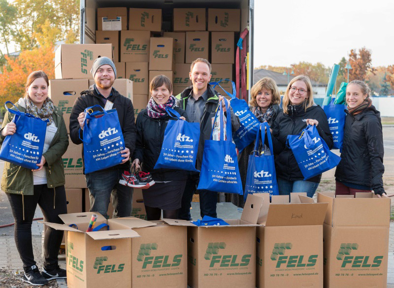 "Ein Herzliches Willkommen": DKFZ-Mitarbeiter sammeln für Flüchtlinge Oktober 2015: Über 950 Taschen, gefüllt mit dringend benötigten Sachspenden für Kinder- und Erwachsene, dazu fünf Umzugskartons voller Sportschuhe: Die Mitarbeiterinnen und Mitarbeiter des Deutschen Krebsforschungszentrums (DKFZ) zeigten sich bei einer Spendenaktion überaus großzügig. Am Mittwoch, 28.10.2015, erfolgte die Übergabe an die Beratungsstelle des Diakonischen Werkes im Patrick-Henry-Village. |