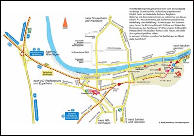 The Heidelberg City Hall is the center of local politics and at the heart of the city administration. It is located directly at the lively "Marktplatz" (Market Square) with a view of the historical Old Town, the world-famous castle ruin, and the course of the Neckar river. Those who want to get there by public transportation or car may print out the map (in German) below.