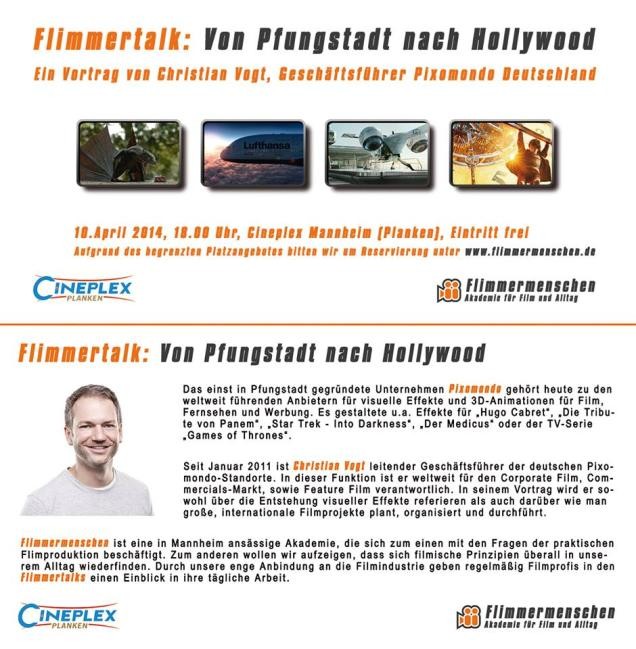 Am 10.04.2014 wird Christian Vogt, leitender Geschäftsführer der deutschen Standorte von Pixomondo im Cineplex Mannheim einen Vortrag über die Entstehung visueller Effekte referieren. Pixomondo gehört zu den weltweit führenden Anbietern für visuelle Effekte und 3D-Animationen für Film, Fernsehen und TV-Werbung und hat unter anderem Filme wie „Hugo Cabret“, „Die Tribute von Panem“, „Star Trek – Into Darkness“ und auch die TV-Serie „Game of Thrones“ mitgestaltet und bietet somit einen umfangreichen Erfahrungsschatz in der Entstehung visueller Effekte und Animationen. Zudem wird Herr Vogt einen interessanten Einblick geben, wie man große, internationale Filmprojekte plant, organisiert und durchführt.
